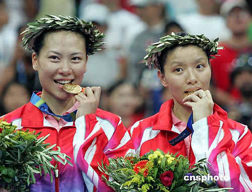 中新網(wǎng)8月21日電 在剛剛結(jié)束的雅典奧運(yùn)會羽毛球女子雙打決賽中,中國選手張潔雯/楊維以2:1戰(zhàn)勝隊員高崚/黃穗,使中國代表團(tuán)再增一枚金牌和一枚銀牌。三局的比分分別為7:15、15:4和15:8。