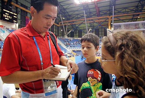 雅典奧運(yùn)會(huì)乒乓球比賽期間,坐在觀眾席上觀戰(zhàn)的中國(guó)乒乓球總教練蔡振華成了外國(guó)小球迷追逐的明星。中新社記者:張煒
