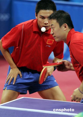 當(dāng)?shù)貢r(shí)間八月二十一日下午,中國乒乓球選手馬琳、陳玘在男雙決賽中以4:1戰(zhàn)勝香港選手李靜、高禮澤,獲得本屆奧運(yùn)會(huì)男子雙打冠軍。中新社記者:任晨鳴