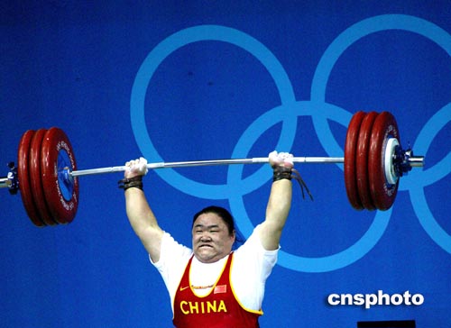 當(dāng)?shù)貢r(shí)間8月21日,中國(guó)選手唐功紅在雅典奧運(yùn)女子75公斤以上級(jí)舉重比賽中,打破挺舉和總成績(jī)兩項(xiàng)世界紀(jì)錄,奪得該項(xiàng)目的金牌。中新社記者:王瑤