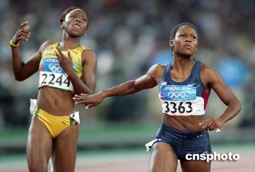 當?shù)貢r間八月二十一日晚,在雅典奧運女子百米飛人大戰(zhàn)中,美國選手威廉姆斯(右)以十秒九六的成績不敵白俄羅斯選手內(nèi)斯特倫科,屈居亞軍。中新社記者:毛建軍