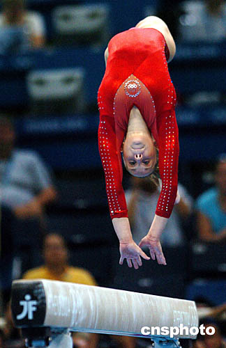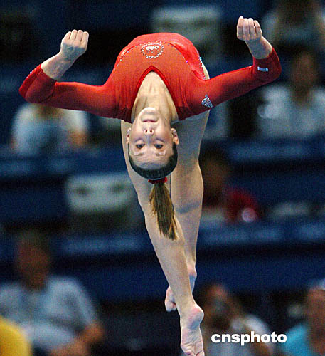 美國選手卡莉(PATTERSON CARLY)在奧運(yùn)會(huì)體操女子全能比賽中,以38.387分獲得金牌。圖為她在比賽時(shí)的表現(xiàn)。