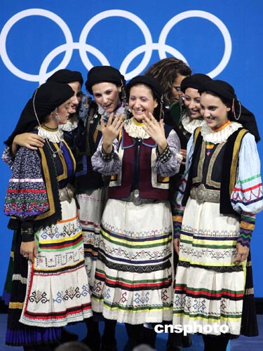 當?shù)貢r間八月二十二日下午,雅典奧運會射擊比賽全部結束,身著民族服裝的頒獎女郎在五環(huán)前留影。中新社記者:毛建軍