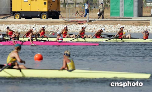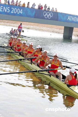 當(dāng)?shù)貢r間八月二十二日,參加雅典奧運女子八人單槳有舵手賽艇比賽的中國隊獲得第四名。中新社記者:毛建軍