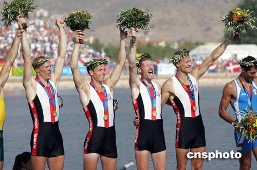當(dāng)?shù)貢r間八月二十二日,丹麥選手獲得雅典奧運男子四人單槳賽艇比賽冠軍。中新社記者:毛建軍