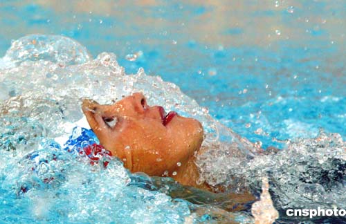 在當?shù)貢r間8月20日進行的女子200米仰泳比賽中,俄羅斯選手Stanislava Komarova獲得銀牌。圖為她在比賽中的表現(xiàn)。