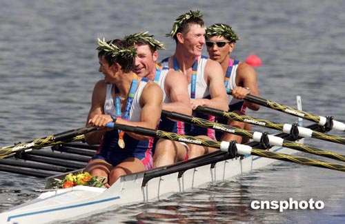 當(dāng)?shù)貢r(shí)間八月二十二日,俄羅斯隊(duì)在雅典奧運(yùn)四人雙槳賽艇比賽中獲得冠軍。中新社記者:毛建軍