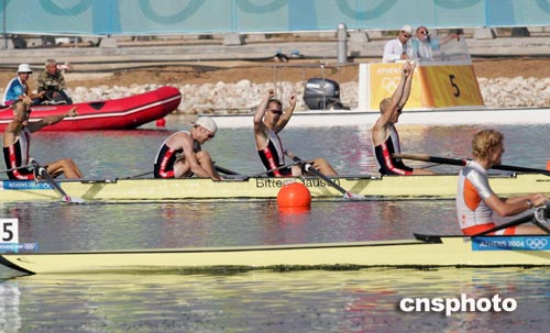 當(dāng)?shù)貢r間八月二十二日,丹麥選手獲得雅典奧運(yùn)男子四人單槳賽艇比賽冠軍。中新社記者:毛建軍