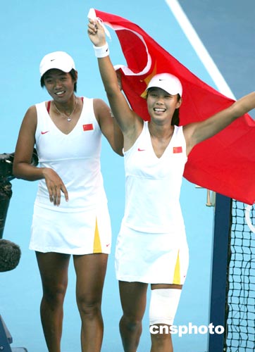 雅典時(shí)間8月22日傍晚,中國(guó)網(wǎng)球選手孫甜甜、李婷(左)在奧運(yùn)會(huì)女子雙打決賽中以二比零戰(zhàn)勝西班牙選手,令人震驚地獲得冠軍。中新社記者:任晨鳴