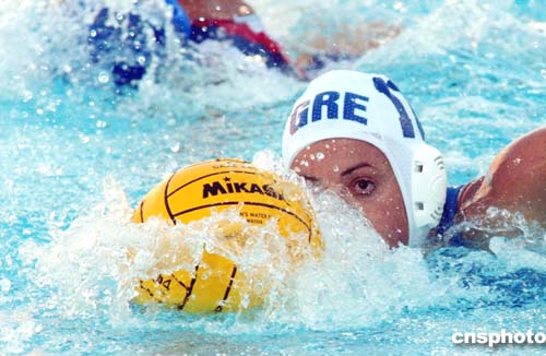 圖為當(dāng)?shù)貢r(shí)間22日希臘與俄羅斯在水球比賽中的爭(zhēng)奪。最終希臘隊(duì)以7-4取勝。