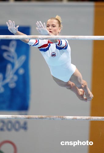 當(dāng)?shù)貢r(shí)間八月二十二日晚,在雅典奧運(yùn)女子體操單項(xiàng)決賽中,俄羅斯“冷蝴蝶”霍爾金娜在高低杠上失誤落下,失去奪金機(jī)會(huì)。中新社記者:毛建軍