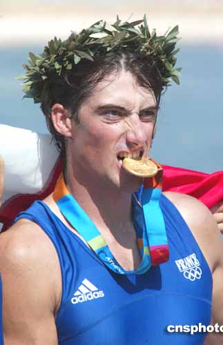 在當?shù)貢r間21日舉行的男子賽艇雙人雙槳比賽中,法國選手安德恩-哈蒂與隊友賽巴斯蒂安-威勒登特一起取得金牌。