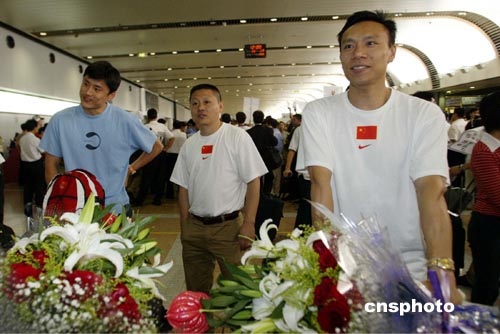 8月23日,在雅典奧運(yùn)會(huì)與金牌失之交臂的中國(guó)男子花劍著名三劍客葉沖、董兆致和王海濱回到北京,在首都國(guó)際機(jī)場(chǎng)受到人們的熱烈歡迎。中新社記者:盛佳鵬