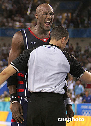 圖為美國籃球隊(duì)選手拉馬爾-奧多姆(Lamar Odom)對裁判的判罰相當(dāng)不滿。