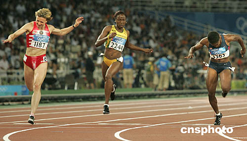 圖為在男女100米決賽中,選手們最后沖線的鏡頭。