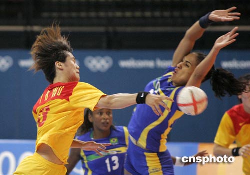 中新社雅典八月二十三日電 中國女子手球隊(duì)今天在最后一場小組賽中以二十八比二十三戰(zhàn)勝巴西隊(duì),四戰(zhàn)兩勝兩負(fù)積四分名列小組第三位,進(jìn)入八強(qiáng)。