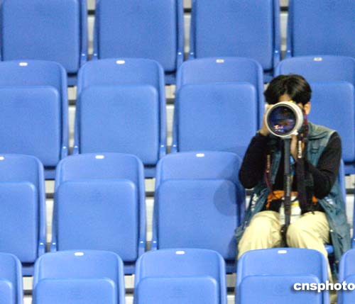 圖為當(dāng)?shù)貢r間23日進(jìn)行的男子94公斤級舉重賽場上的攝影者。