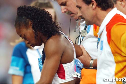 在當?shù)貢r間22進行的女子100米跨欄比賽中,美國選手Gail Devers因摔倒而不得不離開賽場。