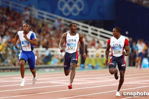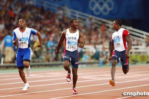 在當(dāng)?shù)貢r(shí)間22日進(jìn)行的男子100米半決賽中,美國(guó)選手Justin Gatlin和Shawn Crawford一邊比賽,一邊交談。
