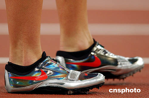 圖為在女子400米半決賽中,一名選手的球鞋特寫鏡頭。