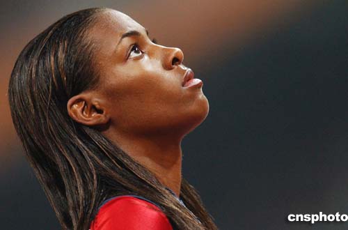 圖為女子400米半決賽前,美國(guó)選手Dee Dee Trotter集中精神為自己鼓勁的鏡頭。