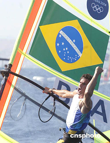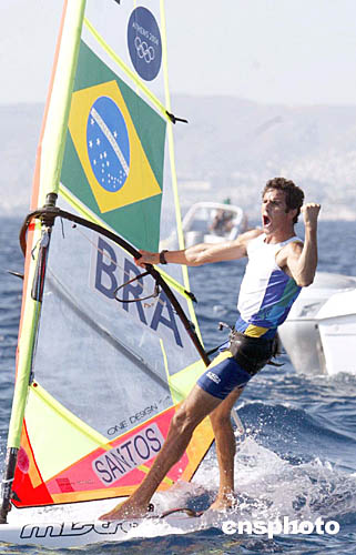 圖為巴西選手SANTOS Ricardo在當?shù)貢r間8月23日舉行的帆船帆板比賽中的表現(xiàn)。