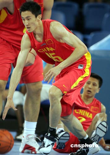 中國男籃在雅典奧運(yùn)會小組賽最后一場比賽中以一分險勝世界冠軍塞黑隊闖入前八名,以替補(bǔ)大前鋒出戰(zhàn)的杜鋒(15號球衣)表現(xiàn)喜人,在最后關(guān)頭鎖定勝局。中新社記者:任晨鳴