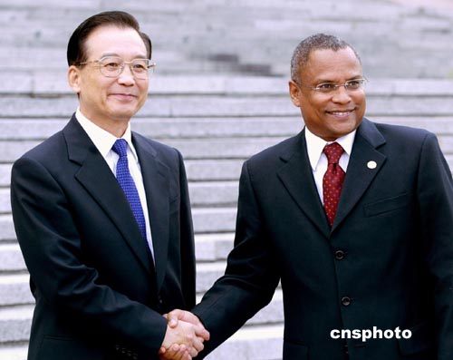 中新社北京八月二十四日電 (記者 朱大強(qiáng))中國國務(wù)院總理溫家寶今天在人民大會堂與佛得角總理內(nèi)韋斯舉行會談,雙方一致表示愿共同努力,推動兩國關(guān)系全面發(fā)展。