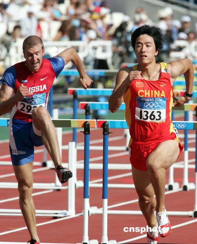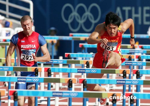 當(dāng)?shù)貢r(shí)間八月二十四日,中國著名田徑選手劉翔(右)亮相雅典奧運(yùn)賽場,在男子一百一十米跨欄預(yù)賽中,以十三秒二七的成績名列小組第一進(jìn)入第二輪預(yù)賽。中新社記者:毛建軍