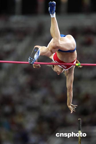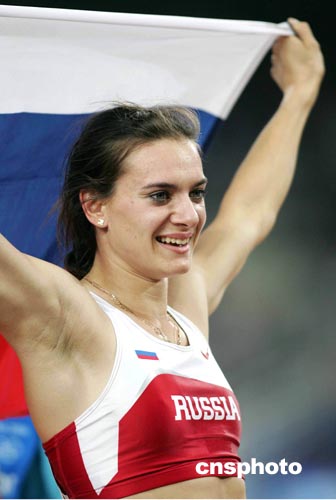 在全場觀眾的歡呼聲中,俄羅斯女將伊辛巴耶娃今晚在雅典奧運(yùn)會田徑賽場神奇般地越過四米九一,不僅將奧運(yùn)會女子撐桿跳金牌歸于名下,并且創(chuàng)造了田徑賽事開賽以來首項(xiàng)世界紀(jì)錄。