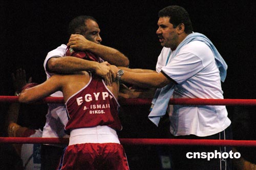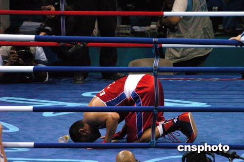 雅典時(shí)間八月二十四日,在奧運(yùn)拳擊四分之一決賽中,埃及選手艾哈邁德?lián)魝ED選手后,因醫(yī)生決定中止比賽而宣告獲勝,艾哈邁德跪地向在場(chǎng)觀眾道歉。作者:陳佳