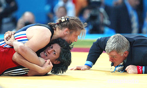 圖為在8月23日舉行的女子63公斤級(jí)比賽中,希臘選手ZYGOURI Stavroula對(duì)陣法國選手LEGRAND Lise的一幕。
