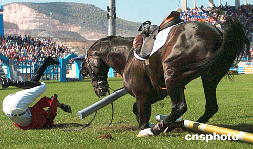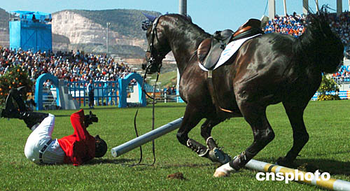 圖為阿根廷選手LUCAS WERTHEIN在當(dāng)?shù)貢r(shí)間8月24日舉行的馬術(shù)比賽中不慎從馬背上摔下來的情景。