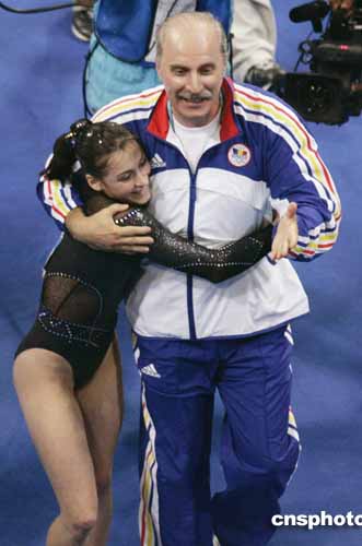 圖為當(dāng)?shù)貢r(shí)間23日,羅馬尼亞選手卡-波諾獲得平衡木比賽冠軍后擁抱她的教練的鏡頭。