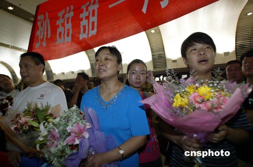 8月25日,在雅典奧運(yùn)會(huì)奪得女子網(wǎng)球雙打冠軍的李婷、孫甜甜載譽(yù)回京,在北京首都國際機(jī)場(chǎng)受到熱烈的歡迎。中新社記者:盛佳鵬