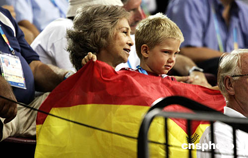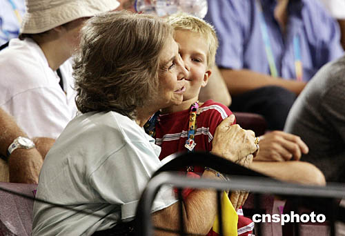 圖為西班牙皇后索菲亞與她的孫子在觀看西班牙隊(duì)和德國隊(duì)的手球比賽。