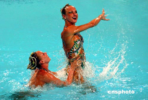 當(dāng)?shù)貢r間8月24日晚,美國隊(duì)在雅典奧運(yùn)會進(jìn)行雙人花樣游泳比賽。中新社記者:王瑤