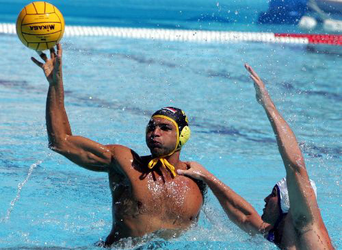 當(dāng)?shù)貢r間8月25日上午,雅典奧運會男子水球比賽進入白熱化階段,非洲冠軍埃及隊(黑帽)雖然竭盡全力防守和進攻,但是由于實力差距較大而以1比12的懸殊比分負于克羅地亞隊。比賽中,一名克羅地亞隊員在對方門射門時用手強行按下對手肩膀,雖然被判犯規(guī),但阻止了對方一次頗有危險的射門。 作者:任晨鳴