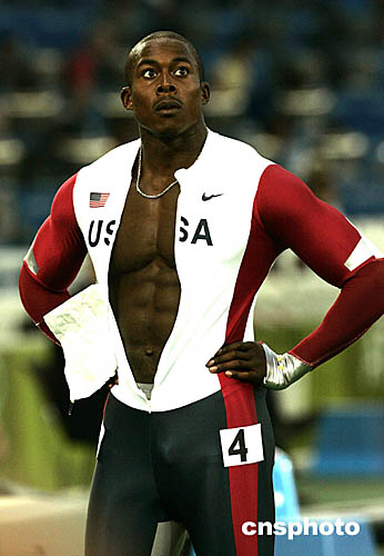 圖為美國(guó)選手克勞福德(CRAWFORD Shawn)和加特林(Justin Gatlin)在男子200米預(yù)賽中,沖過(guò)終點(diǎn)后向左看積分牌的鏡頭。