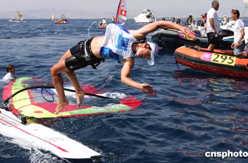在當(dāng)?shù)貢r間8月25日進(jìn)行的女子帆船帆板米斯特拉級比賽中,法國選手馬萊特奪取金牌。