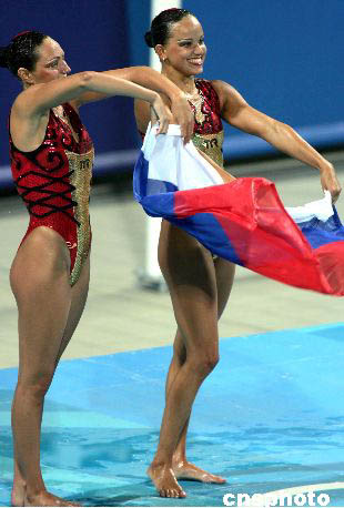 當(dāng)?shù)貢r間8月25日晚,在雅典奧運會花樣游泳決賽中,俄羅斯選手以完美的表演和極具感染力的藝術(shù)氣質(zhì)毫無爭議地獲得冠軍,登上奧運會最高領(lǐng)獎臺。中新社記者:任晨鳴
