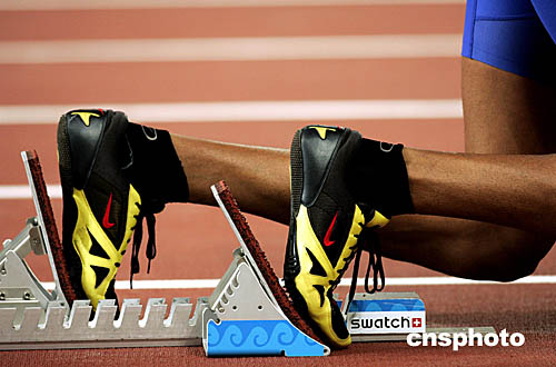 圖為在田徑場(chǎng)上進(jìn)行的200米比賽時(shí),選手起跑前對(duì)腳部的鏡頭特寫(xiě)。