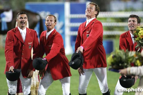 在當(dāng)?shù)貢r間8月24日進(jìn)行的馬術(shù)障礙賽團(tuán)體賽中,德國隊榮獲第一,這是他們的隊員Otto Becker, Marco Kutscher,Christian Ahlmann和Ludger Beermaun(從左到右)慶祝的場面。