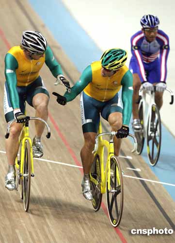 在當(dāng)?shù)貢r(shí)間25日進(jìn)行的男子場地自行車凱林賽中,澳大利亞選手拜雷和凱利分獲金牌與銅牌。圖為他們相互慶祝的場面。