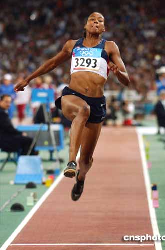 圖為當(dāng)?shù)貢r(shí)間25日,美國著名運(yùn)動(dòng)員瓊斯在跳遠(yuǎn)比賽資格賽中的表現(xiàn)。