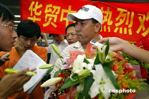 8月26日,北京首都國(guó)際機(jī)場(chǎng)又迎來(lái)一批載譽(yù)歸來(lái)的奧運(yùn)健兒,包括羽毛球、乒乓球、游泳、體操、舉重等200多名選手,他們?cè)跈C(jī)場(chǎng)受到英雄般的歡迎,幾乎每個(gè)人都被鮮花包圍。圖為中國(guó)羽毛球隊(duì)總教練李永波甫抵機(jī)場(chǎng)就成為記者采訪(fǎng)焦點(diǎn)。中新社記者:盛佳鵬