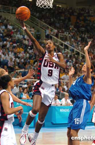 圖為當地時間25進行的美國與希臘的女子籃球賽中,美國WNBA明星萊斯利一個漂亮的抄手上籃。