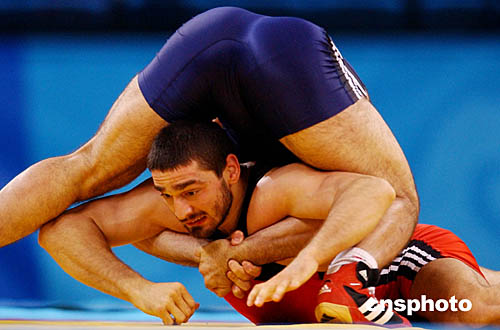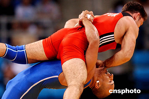 圖為當(dāng)?shù)貢r(shí)間8月26日舉行的男子74公斤級(jí)自由式摔交比賽中,烏茲別克斯坦選手Alexandr Dokturishivili和俄羅斯選手Vateres Samourgachev的比賽情況。