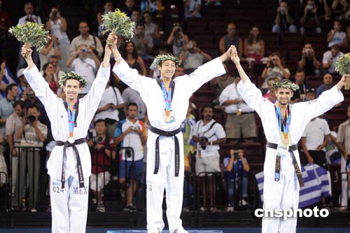 當(dāng)?shù)貢r(shí)間八月二十六日晚,在雅典奧運(yùn)會男子五十八公斤級跆拳道決賽中,中國臺北選手朱木炎戰(zhàn)勝墨西哥選手SALAZAR獲得金牌。中新社記者:毛建軍