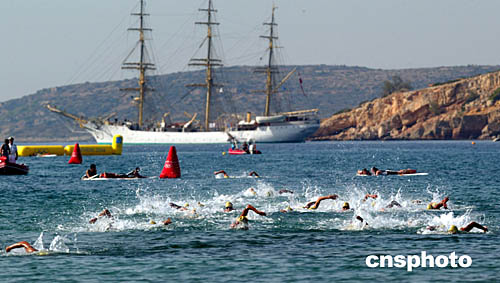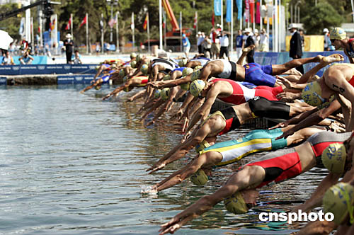圖為在當(dāng)?shù)貢r間舉行的男子鐵人三項比賽中選手們的表現(xiàn)。